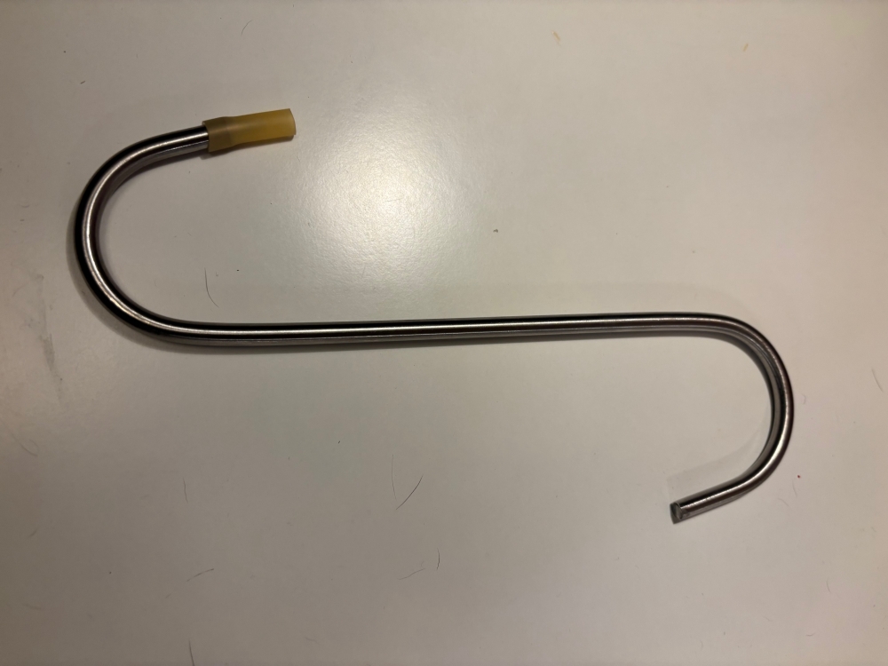 Dette slakte opphenget har spisse kroker å henge viltet i. Bredden er 32 cm. Man kan sette det permanent fast eller bruke en kjøttkrok.